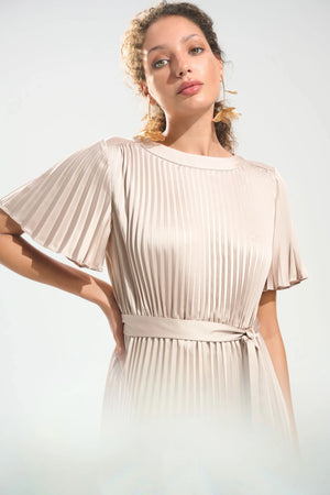 You'll be the bell of the ball in this satin feel, fit and flare (plisse) pleat dress with a sash belt.